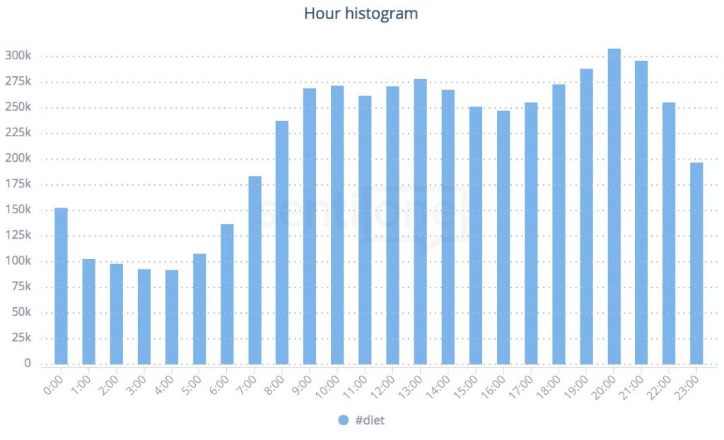 For example, writing about the benefits of diet catering, we would probably be able to catch up monitoring #diet. What hours have the Internet users talked about this topic most often over the last 12 months?