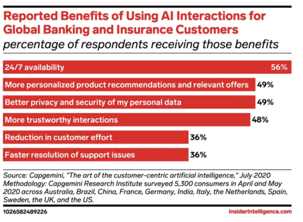 Virtual assistants can access customer profiles instantly and offer recommendations based on their insurance status, history and lifestyle. Almost 50% of clients report that AI interactions provide more relevant offers, better privacy and more trustworthy interactions.