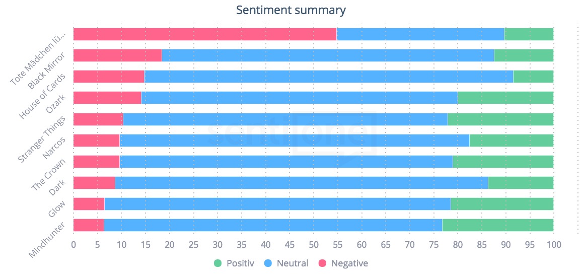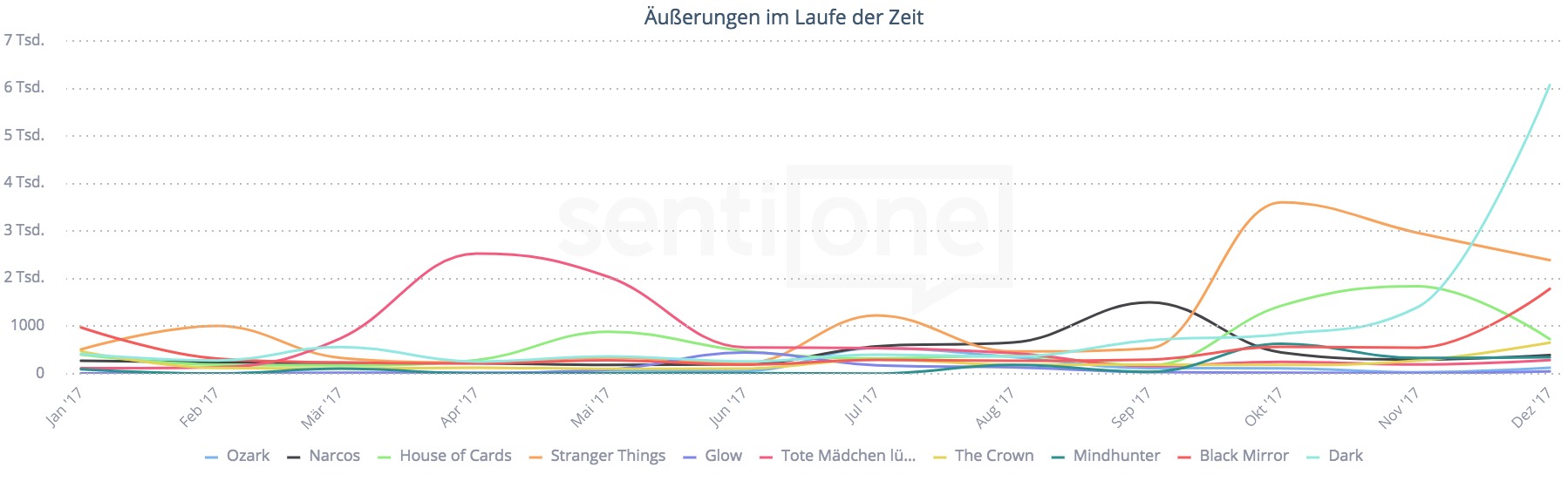 Wohl am kontroversesten wurde die Serie „Tote Mädchen lügen nicht” (im Original „13 Reasons Why”) diskutiert. Jugendschützer hätten diese am liebsten auf den Index gesetzt. Die Serie basiert auf dem Roman von Jay Asher. Ein Mädchen begeht Selbstmord und in ihrem Nachlass befindet sich eine Box mit Kassetten. Darauf erläutert sie ihren Mitschülern 13 Gründe für die Tat. Laut einem Artikel von W&V war das Netflix-Original, gemessen an Tweets, das erfolgreichste Format des Jahres 2017. Die Analyse von SentiOne zeigt ein anderes Bild. Wie man deutlich erkennen kann, überstieg die britische Science-Fictionserie „Black Mirror” die Serie rund um die Teenager.