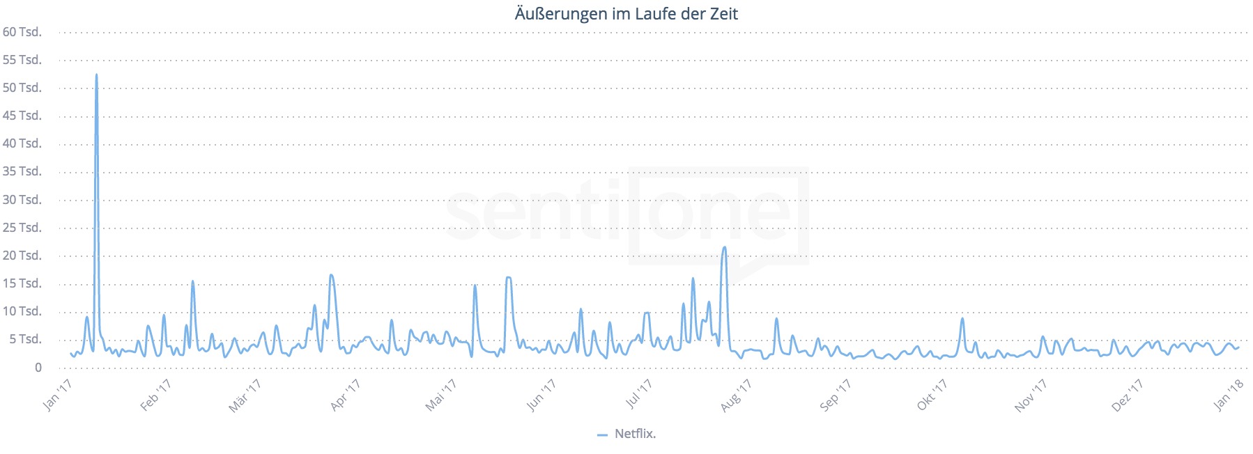 Aber nicht nur die Netflix-Serien sind Gesprächsthema im Internet, sondern auch der Streaminganbieter selbst. So ergab eine Analyse, dass 2017 das amerikanische Unternehmen Bestandteil von über 1,5 Millionen Online-Erwähnungen war. Im Januar wurde besonders der Ausdruck „Netflix and Chill” heiß diskutiert. Bei der Redewendung, die es tatsächlich in das Urban Dictionary geschafft hat, handelt es sich um die codierte Verabredung zu Sex. Wo man früher noch fragte, nicht noch auf einen Kaffee nach oben mitkommen zu wollen, steht heutzutage eben dieser Begriff.