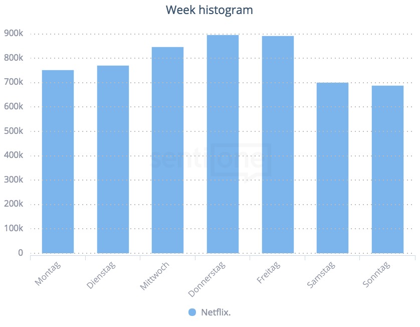 Wann über Netflix online gesprochen wurde, sieht man bei SentiOne neuerdings mit Hilfe des Week Histograms. So waren es letztes Jahr vor allem der Donnerstag und Freitag.