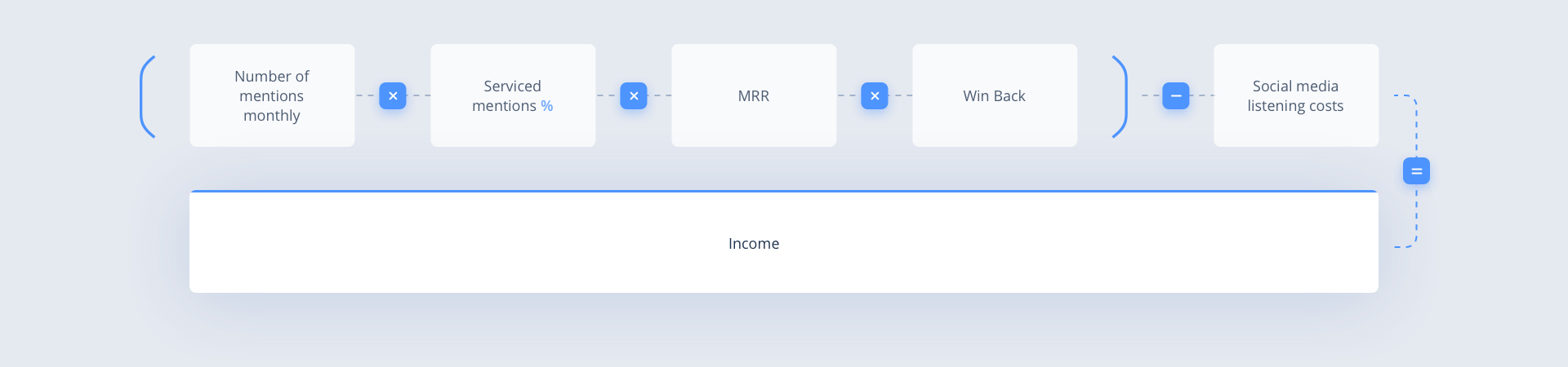 (Número de menciones mensuales * Menciones atendidas% * MRR * Recuperación) – Costos de escucha en redes sociales = ingresos