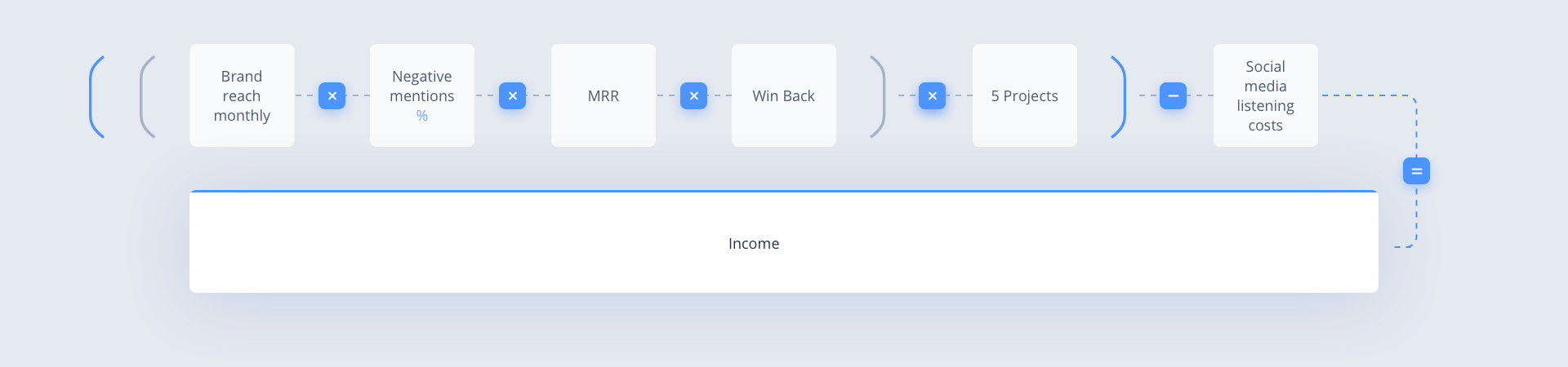 ((Marca alcanza mensualmente * menciones negativas% * MRR * Win Back) * 5 proyectos) – Costos de escucha en redes sociales = ingresos