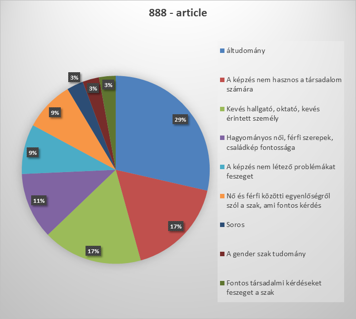1. Az, hogy a képzés „áltudomány”, valamint, hogy „a képzés nem hasznos a társadalom számára”, mindegyik hírportál kommentelői körében megjelenik a leggyakoribb öt érv között. A 888, a mandiner és a 444 esetében ezek a két legnagyobb gyakoriságú érvek között találhatóak. Az, hogy a szak a „keresztény értékrenddel nem egyeztethető össze”, a kuruc.info és a 444 esetében is megjelenik, a Sorosra való hivatkozás azonban csak az előbbire jellemző a portálok között.