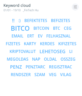 A SentiOne kulcsszó felhője az adott témában és időszakban, a közösségi és online médiában a leggyakrabban előforduló szavakat (a betűméret nagysága az egymáshoz viszonyított gyakoriságot jelöli) gyűjti össze.