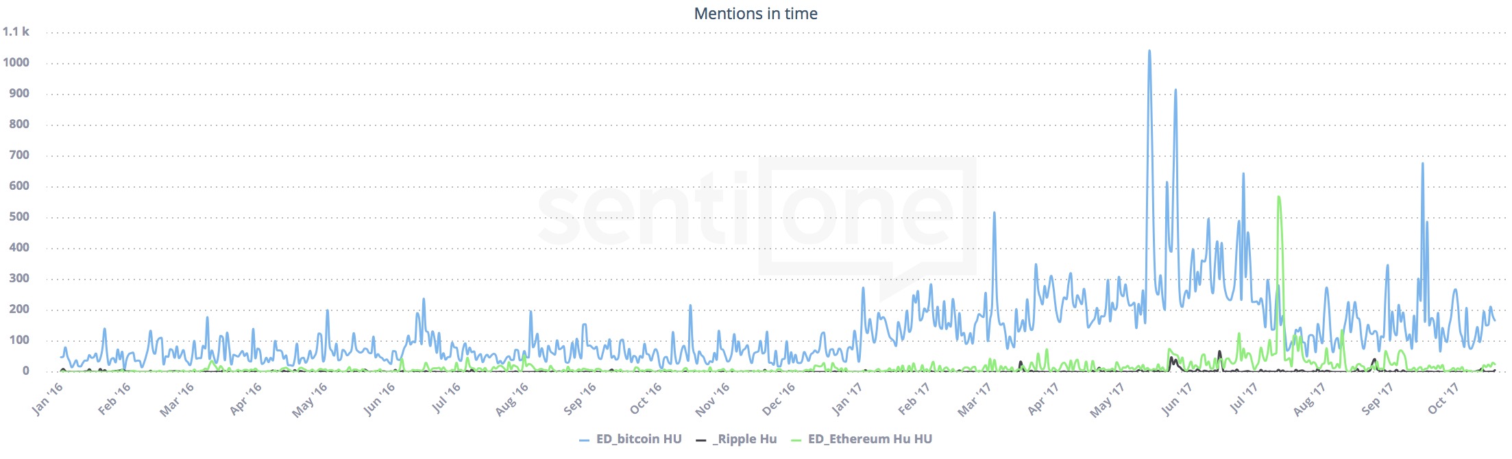 Az alábbi ábra kék hullámvonala a Bitcoinhoz kapcsolódó online említések időbeli megoszlását mutatja, míg a zöld az Ethereumét. (A fekete a ‘Ripple’ kriptovaluta. Viszonyítás képpen. Amúgy jelenleg közel 1200 kriptovaluta létezik összesen.) Gyönyörűen látszik, hogy szinte egymásnak adják át a helyet, mintegy újra- és újrateremtve, egyben egyre bonyolultabbá és diverzifikáltabbá téve a “piacot’. Nehezítve annak dekódolását a mindennapokra vetítve.