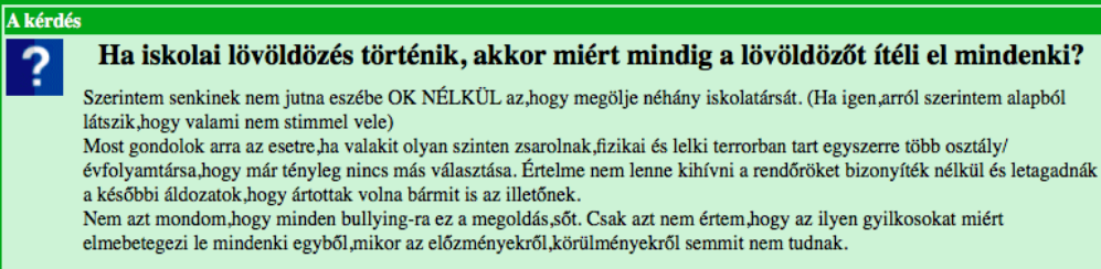 Természetesen a fórum profiljából fakadóan pont annyiféle kérdés van fent, ahányféle ember. Ami figyelmet követel az a megdöbbentő trend, hogy a szépségtippektől kezdve egészen a depresszióig vagy akár a bántalmazásig húzódik a tartalmak íve.