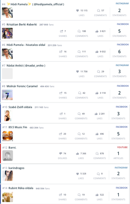 *A SentiOne egy saját fejlesztésű algoritmus alapján állít fel rangsort azon egyéni online felhasználók között, akik a legtöbb tartalmat tették közzé adott témával kapcsolatban, a meghatározott időszakban. Ezt a számot ugyanakkor kombinálja az adott tartalmakra érkezett lájkok, megosztások, kommentek számával, valamint adott oldal követőbázisának nagyságával is.