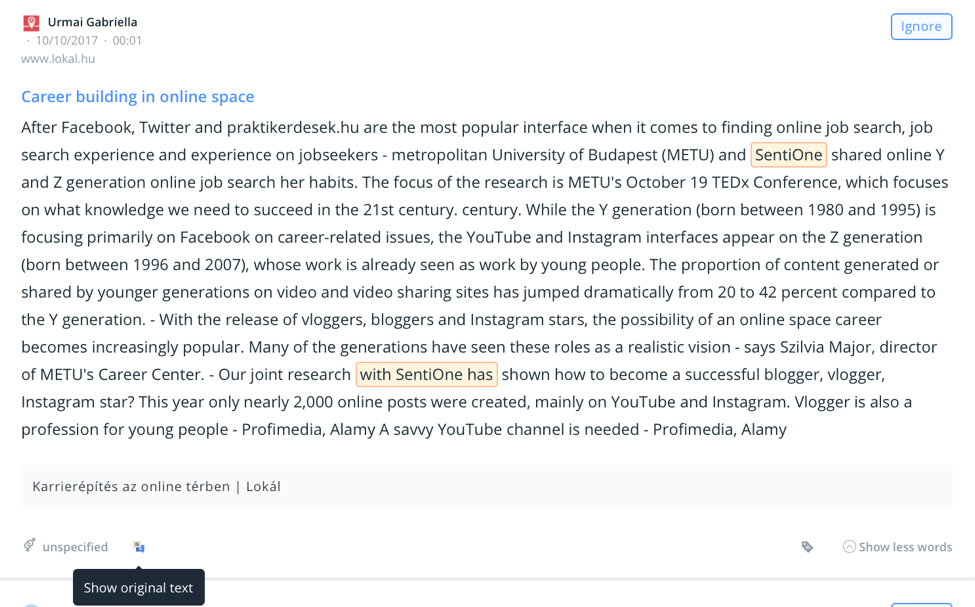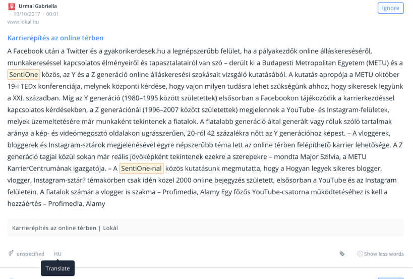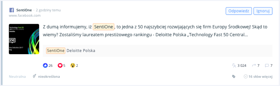 A SentiOne a Facebook posztok esetében ugyanakkor nem csupán a bejegyzések érzelmi hátterét ismeri fel, de a szerző nemét is (nagy előny: célcsoportképzés). Emellett regisztrálja az elérés nagyságát, a megosztások és kommentek számát, valamint mostantól értelmezi a szimbólumalapú reakciók (emojik) jelentését is.