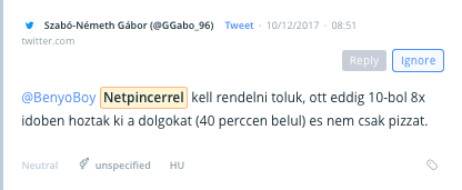 Ha hétfő, akkor például Netpincér. Lehet, azt gondolnánk: hétvégén van rá a legnagyobb szükségünk, ugyanakkor az ezzel kapcsolatos webes kommunikációs dömping bizony hétfőn landol az interneten. Vajon azért, mert hétvégén mi magunk főzünk otthon? Vagy mert pont, hogy nem főzünk, és nincs mit ennünk a hétfői ebédszünetben? Az eredmények mögötti konkrét miértek persze kideríthetők a SentiOne-ból.