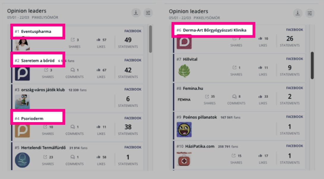 A pikkelysömör esetében például a SentiOne véleményvezér-listája alapján egyértelműen beazonosíthatóak azok a közösségimédia-birodalmak, amelyek egy-egy termék reklámozására épülnek.