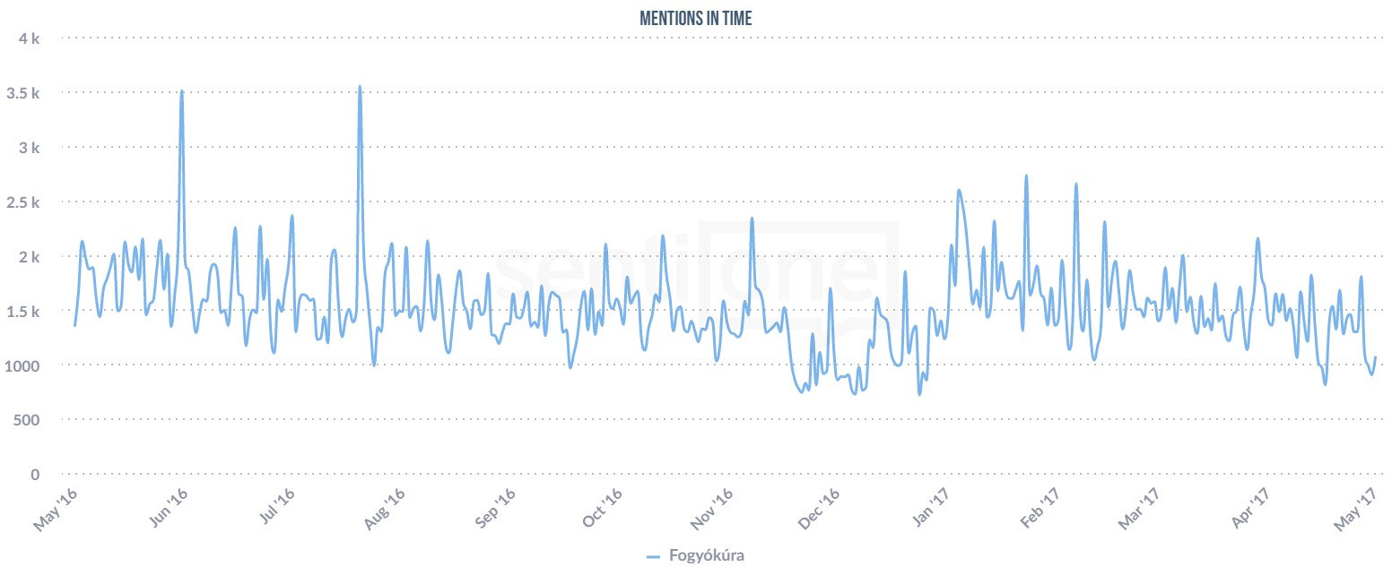 Először is, több mint 555 000 olyan bejegyzést 2016. május 1. és 2017. május 1. között, ahol a fogyókúráról és a diétáról diskuráltak az emberek online. Kétségkívül trendi téma ez, amelyre bizony érdemes odafigyelni – éhes és kíváncsi felhasználóként és olyan márkaként is, melynek portfóliójában helyet kapnak ilyen típusú termékek. A legnépszerűbb hónapok a június, az augusztus és a január. Ekkor beszélünk a legtöbbször online a fogyókúráról.