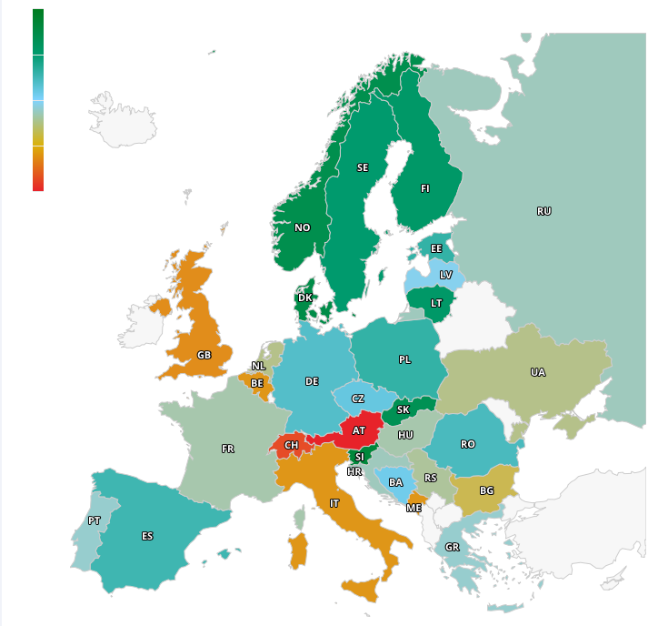 A film legnagyobb rajongótábora az említések alapján Szlovéniában él (zöld). Őket követik a norvégok és a szlovákok. Magyarország ezekhez viszonyítva az ‘Eh’ kategóriába esik, azaz tényleg megosztotta a film a kommentelőket: savazták is, szerették is. Az osztrákok kifejezetten utálták a nyolcadik részt, ha az internetes tartalmakat nézzük (piros). És a svájciak is.