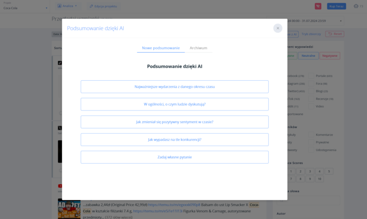 Collecting data is only the beginning. The real value lies in its instant and accurate interpretation. That’s why SentiOne is doubling down on artificial intelligence. The new AI Project Assistant eliminates the need for manual setup of complex monitoring projects—automatically generating the right query, selecting keywords, and applying filters. This not only saves time but democratizes analytics, allowing anyone on the team to independently seek answers to their questions without being an expert in logic-based search syntax.