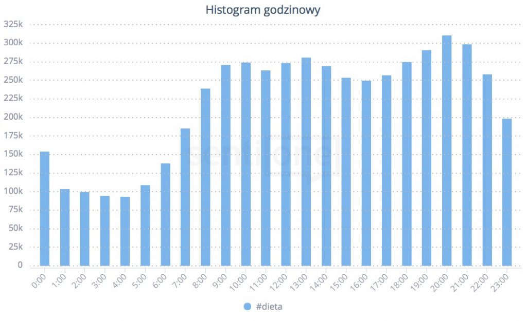 I tak, pisząc na przykład o zaletach cateringu dietetycznego, podpięlibyśmy się pewnie pod #dieta. Jak wyglądały rozmowy internautów na ten temat na przestrzeni ostatnich 12 miesięcy, biorąc pod uwagę godziny ich występowania?