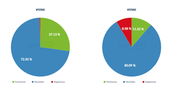 Najbardziej zauważalny jest wzrost negatywnych komentarzy (kolor czerwony). Warto jednak zwrócić uwagę na spadek tych pozytywnych. Jeszcze lepiej widać to na wykresie kołowym: