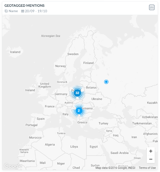 Geolokalizacja dostępna jest we wszystkich pakietach PRO. Aby włączyć funkcję, należy na dashboardzie klikąć opcję “Dostosuj” w prawym górnym rogu, po czym w sekcji “Analiza treści”, zaznaczyć “Geotagowanie wypowiedzi”. Wówczas na dole dashboardu pojawi się mapka wyników z wybranego okresu czasowego.