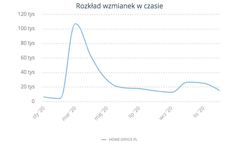 Hasło “home office” zostało użyte w Polsce prawie 350 000 razy w roku 2020, z czego aż 100 000 wzmianek pojawiło się tylko w marcu. Jest to wzrost o 750% porównując z rokiem 2019. Aż 58% wypowiedzi na temat pracy zdalnej należy do mężczyzn. Home office był wymieniany 350 000 razy, jednak zdobył wyświetlenia na poziomie 595 milionów. Oznacza to, że choć nie wszyscy wypowiadają się w temacie pracy zdalnej, to zdecydowana większość chce o niej czytać i przesyłać ciekawe artykuły dalej.
