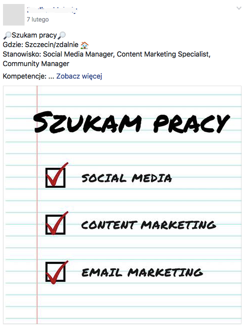 Przykładowe ogłoszenie poszukującego pracy na Facebooku.