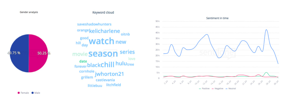 Przykładowe dane z social listeningu: analiza płci, słowa kluczowe i dynamika wypowiedzi dla tematu „Netflix”.