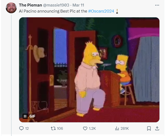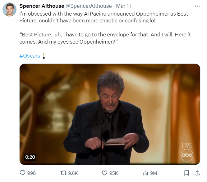 Najlepszy film nie podzielił internautów – ale sposób, w jaki Al Pacino ogłosił zwycięzcę już tak. Najpierw zapytał, czy “to będzie Oppenheimer”, później otworzył kopertę i potwierdził: „Tak! Moje oczy widzą Oppenheimera”. Część odbiorców uznała, że przekazał informację w najgorszy sposób, jaki tylko można było to zrobić: