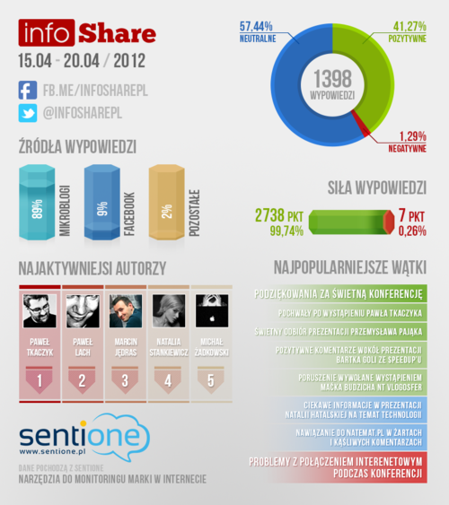 Wśród osób, które swoimi wypowiedziami najczęściej nawiązywały do konferencji InfoShare są Paweł Tkaczyk, Paweł Lach, Marcin Jędras, Natalia Stankiewicz oraz Michał Żadkowski. Niewiele konferencji w Polsce może pochwalić się taką liczbą wypowiedzi (1398) z tak bardzo pozytywną oceną końcową wystawioną przez samych internautów. Na koniec warto podkreślić, że siła wypowiedzi pozytywnych wynosiła, aż 99,74%.