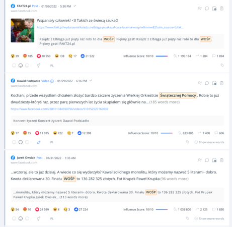Najpopularniejsze wzmianki pochodziły jednak z innych kont. Największym zasięgiem cieszy się post na Facebooku serwisu Fakt24, opisujący księdza z Elbląga który już piąty rok z rzędu przekazał całą ofiarę z mszy na finał. Post ten dotarł do ponad 1 200 000 internautów i zebrał ponad 10 000 “serduszek!”