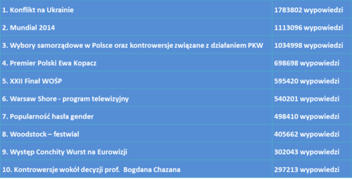 Tematy poruszane najczęściej w sieci w 2014 to wg SentiOne: