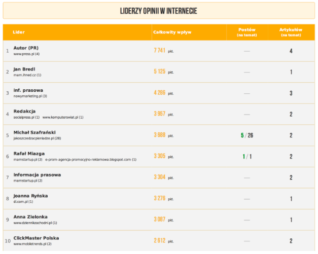 Natomiast trzecia część, to lista tworzona na podstawie danych z pozostałych rejonów internetu, czyli m. in. portali, forów czy blogów. Na “liderów opinii w internecie” składają się informacje dotyczące postów, artykułów oraz całkowitego wpływu lidera.