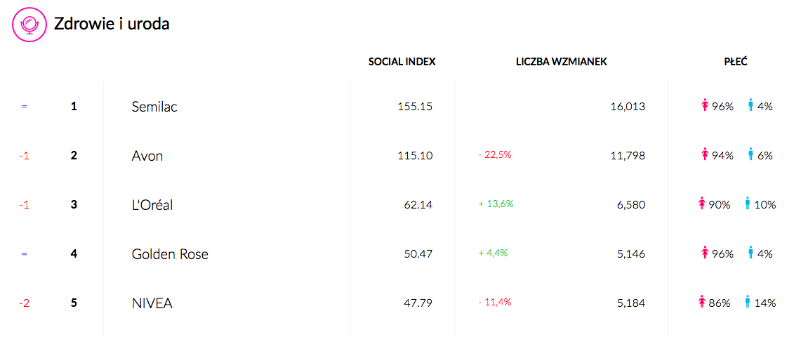 Polki pokochały kolorowe paznokcie, a Semilac doskonale wykorzystuje komunikacyjnie tę miłość, zajmując 12. miejsce w rankingu ogólnym i zgarniając złoto w swojej kategorii! Co ciekawe, cała kategoria zdominowana jest przez płeć piękną, ale w przypadku tej marki pada absolutny rekord – aż 96% wzmianek dodawanych jest przez kobiety.