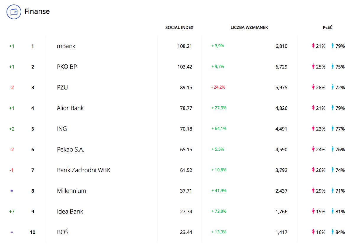 W zestawieniu marek operujących dużymi pieniędzmi zdecydowana większość na zielono – pozycję lidera odzyskał mBank, przed PKO BP i PZU. Wiele pisano na temat Alior Banku i Pekao, które w październiku podpisały list intencyjny w sprawie fuzji, co nie umnęło uwadze internautów. Podobnie, jak roszady kadrowe w Idea Banku czy niedziałający system “Moje ING” – w tym ostatnim przypadku marka zareagowała bardzo sprawnie, na bieżąco informując internautów o problemie i prowadzonych naprawach. Dzięki temu udało się ograniczyć lawinę negatywnych komentarzy, która przy gorszej komunikacji byłaby znacznie bardziej obfita.