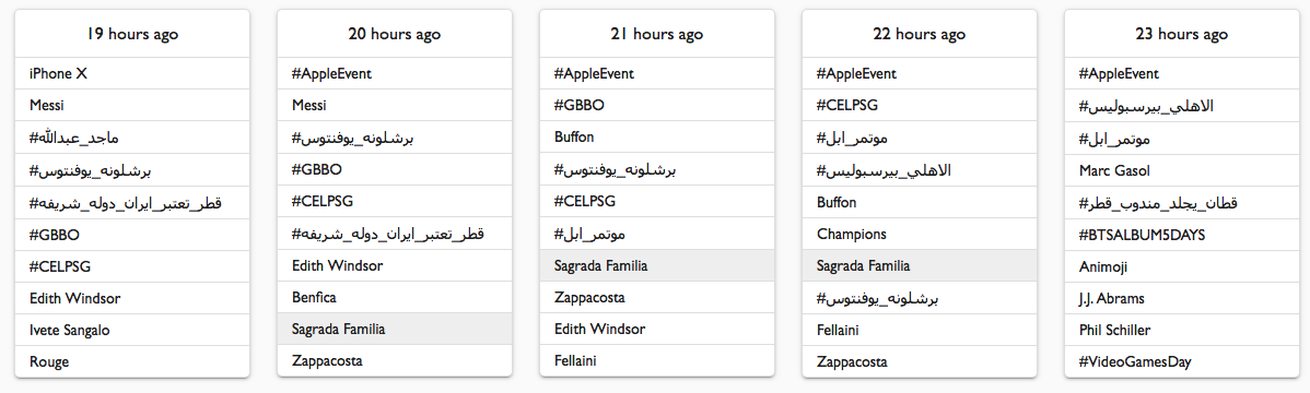 Źródła dyskusji na temat Iphone X i #AppleEvent – po lewej w języku polskim, po prawej w pozostałych językach dostępnych w SentiOne.
