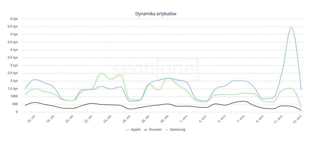 Dynamika artykułów o Apple, Samsungu i Huawei na przestrzeni ostatniego miesiąca. Widok z SentiOne.