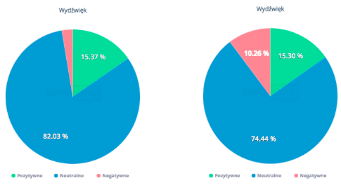 Sentyment wypowiedzi na temat Iphone X i #ApleEvent. Po lewo – w języku polskim, po prawo, w pozostałych językach dostępnych w SentiOne.