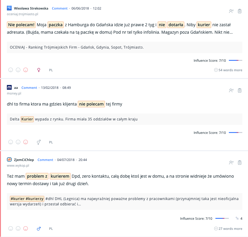 Przy użyciu monitoringu internetu – takiego jak SentiOne, marki mają możliwość analizowania potencjalnie krytycznych sytuacji w świecie online – a takie zdarzają się codziennie. Zniszczone paczki, przesyłki zagubione w drodze do adresata, czy pomyłkowe dostarczenie naszego wymarzonego prezentu do innego właściciela, to dla nich chleb powszedni. Bezpośrednim następstwem wymienionych przeze mnie powyżej sytuacji, jest niestety negatywna reakcja – bardzo często publikowana w Internecie, na przykład na profilach społecznościowych przewoźników. Zazwyczaj w takiej sytuacji rykoszetem odbija się to na marce, producencie zakupionych przedmiotów w formie treści w social mediach, przy oznaczaniu zarówno producenta jak i firmy transportowej często odpowiedzialnej za powstały problem. Znakomita większość firm w branży dba jednak o swój wizerunek i jakość usług, działając według określonych w swojej polityce zasad i bardzo szybko wspierając konsumentów w rozwiązaniu problemu – bywa, że nawet najdrobniejsza sprawa może poruszyć tłumy i sprawić, że wszechobecna niechęć wylewa się na wszystkie strony sporu.