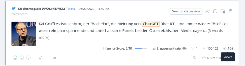 This metric is accessible for each Post (which is what Tweets are now referred to), and the data is sourced directly from X (formerly Twitter), ensuring the highest accuracy possible.