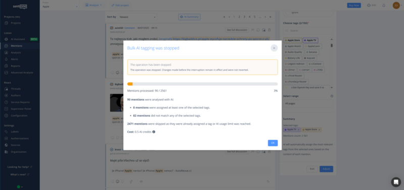 - Increased limit: now up to 100K mentions Work with up to 100K mentions in a single operation, making large-scale analysis and management dramatically more efficient. Perfect for enterprise clients managing long-term projects or high-volume monitoring topics.