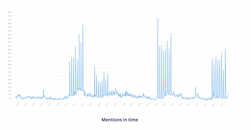 Además, si configuras las palabras clave correctamente y analizas las dinámicas de mención, puedes descubrir las regularidades aplicables al mejor momento para la comunicación de marketing. Los gráficos que mencionan la dinámica en el tiempo brindan información sobre la hora exacta en que las personas hablan en línea sobre algunos temas específicos que están conectados al campo de tu marca.