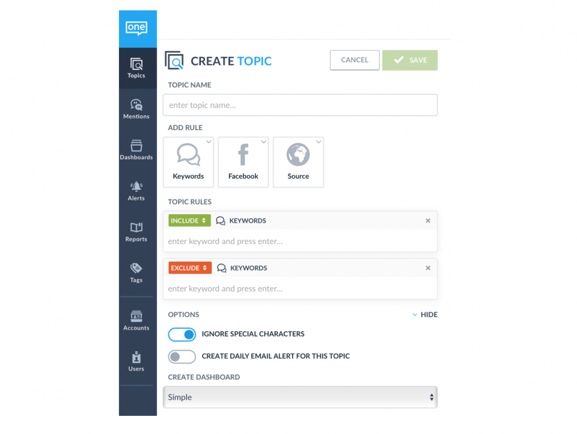 SentiOne habilita alertas críticas personalizables que se envían por correo electrónico (inmediatamente después de que el sistema marca una mención específica como negativa en tiempo real).